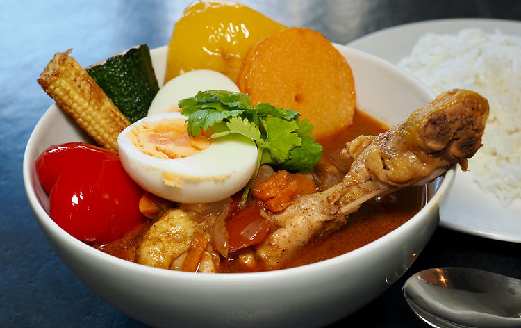 This dish is a relatively new addition to the inventory of Japanese curries. It's unusual because instead of the venerable curry roux cube, the curry is made from individual spices. It's also unusual because it combines a curried soup base with shallow fried vegetables and chicken. It takes more time than your usual Japanese curry but it's worth every penny of the extra effort.